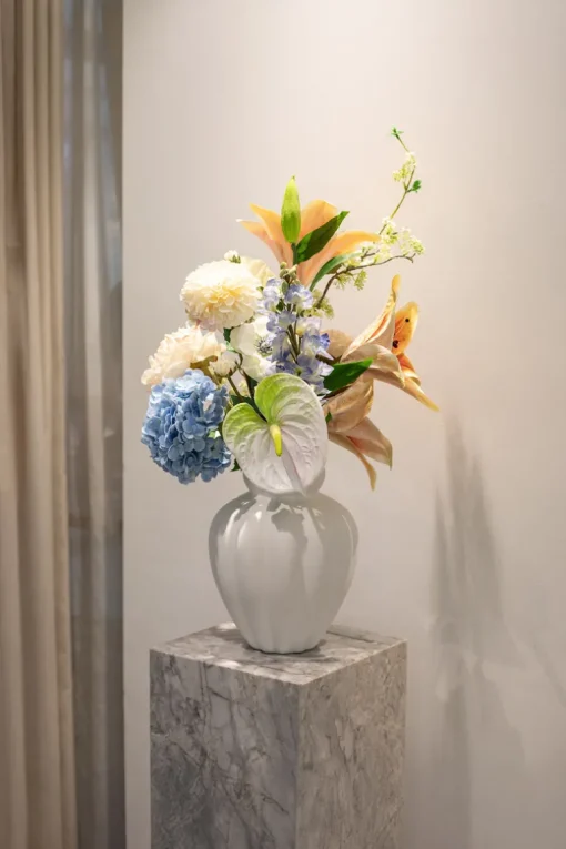 Forny dit hjem med vores eksklusive kunstneriske blomsterbuket. Med sin enestående kvalitet, naturtro udseende og smukke kombination af blomster, vil den tilføje en farverig touch til din indretning.