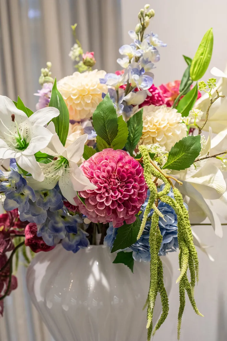 Forny dit hjem med vores eksklusive kunstneriske blomsterbuket. Med sin enestående kvalitet, naturtro udseende og smukke kombination af blomster, vil den tilføje en farverig touch til indretning.